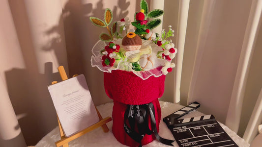 باقة زهور وملاك كروشيه يدوية بتصميم الكريسماس في صوف حمل أحمر - تنسيق احتفالي في سطل مع بطاقة قابلة للتخصيص وإضاءة LED - مثالية لهدايا الأعياد وديكور المنزل