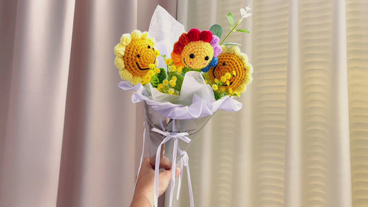 [Shipped from US] Handmade Sunflower Crochet Bouquet Arrangement with Rose Cream Puff - Allergy-Friendly Gift for Birthday Anniversary Get Well