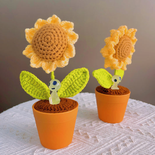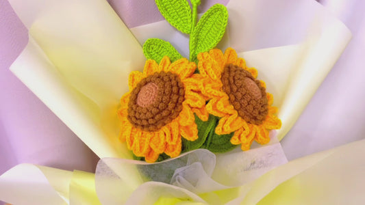 زهور شمس مزينة ومصنوعة يدوياً بالكروشيه مع حزمة خضراء خضراء صغيرة - مثالية لحفلات الزفاف أو عيد ميلاد أو ذكرى الزواج أو الهدايا