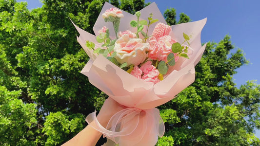 باقة زهور كروشيه يدوية دائمة - ورود، توليب، وقرنفل - هدية خالية من مسببات الحساسية للزفاف، الذكرى السنوية، وأعياد الميلاد