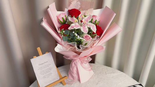 باقة رائعة من الزهور الغزل اليدوية من أشعة الشمس الحلوة مع الورود والزنبق والزنابق واليوكاليبتوس وأكثر - مثالية لعيد الحب أو عيد الأم أو أي مناسبة