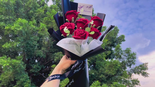 دلو بالكروشيه من 6 ورد بوردي الزهري - كلاسيكي مصنوع يدويًا بالأسود والأحمر، واليوكاليبتوس، ونفس الأطفال - مثالي للهدايا وحفلات الزفاف، ومذكرات العرض الزواج والذكرى السنوية