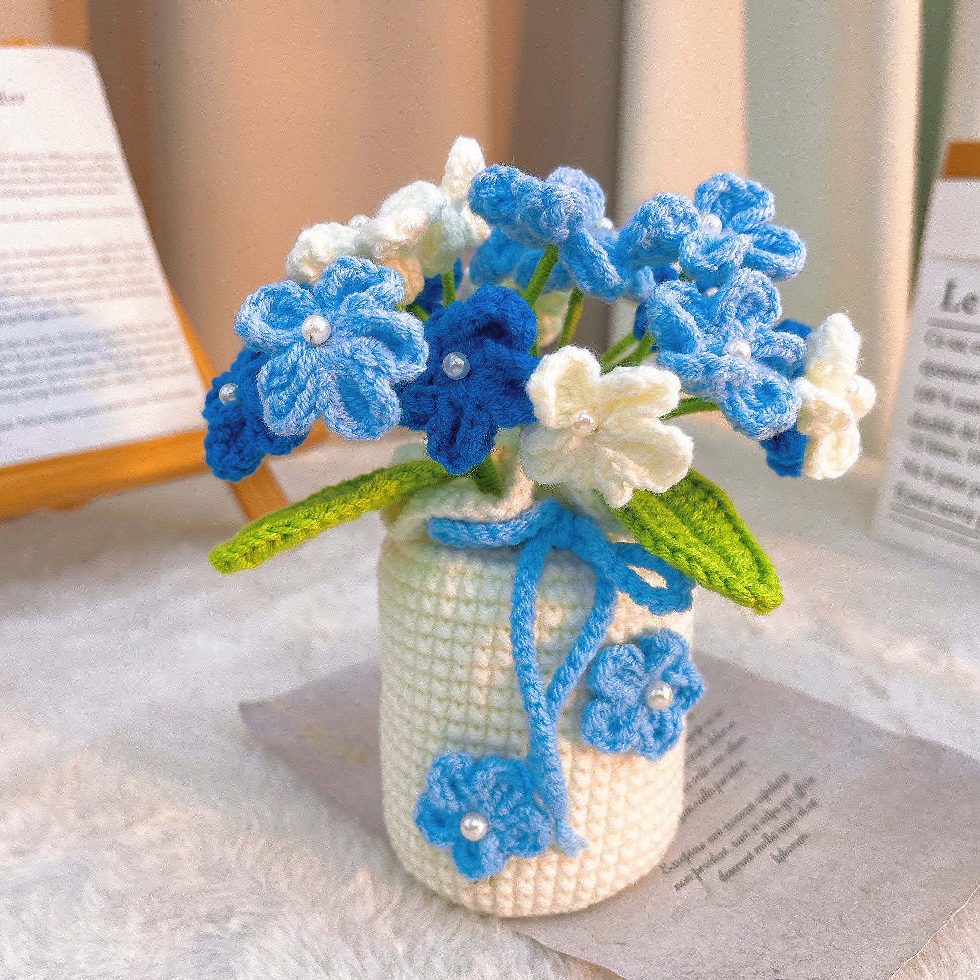نبتة كروشيه يدوية في أصيص من زهور النسيان - تنسيق زهري مزخرف باللونين الأزرق والأبيض - هدية لا تسبب الحساسية لعيد الأم وأعياد الميلاد والمناسبات الخاصة
