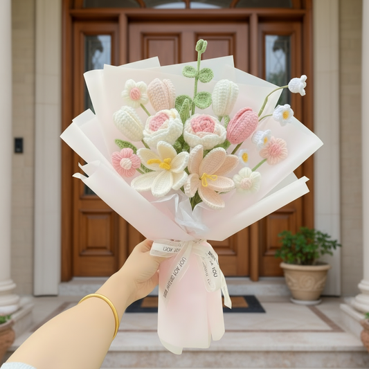 Handmade Crocheted Blushing Elegance Bouquet with Rose, Tulips, Lilies, Eucalyptus & More - Perfect for Any Special Occasion