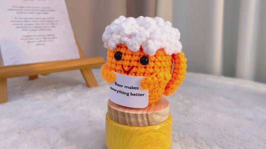 Handmade Crochet Beer in Mug with Wooden Base, Customizable Card Unique Gift for Men, Dad, Husband, Boyfriend, Office, Birthday, Father's Day