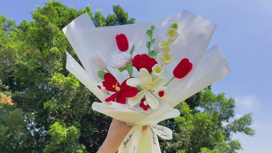 Flores de aniversario de boda tejidas a mano con crochet, que incluyen una lirio blanco, tulipanes amarillos y rojos, un girasol, una camelia roja, lirios de la valle rojos, peonías borgoña y hojas de eucalipto, envueltas en organza perlada.