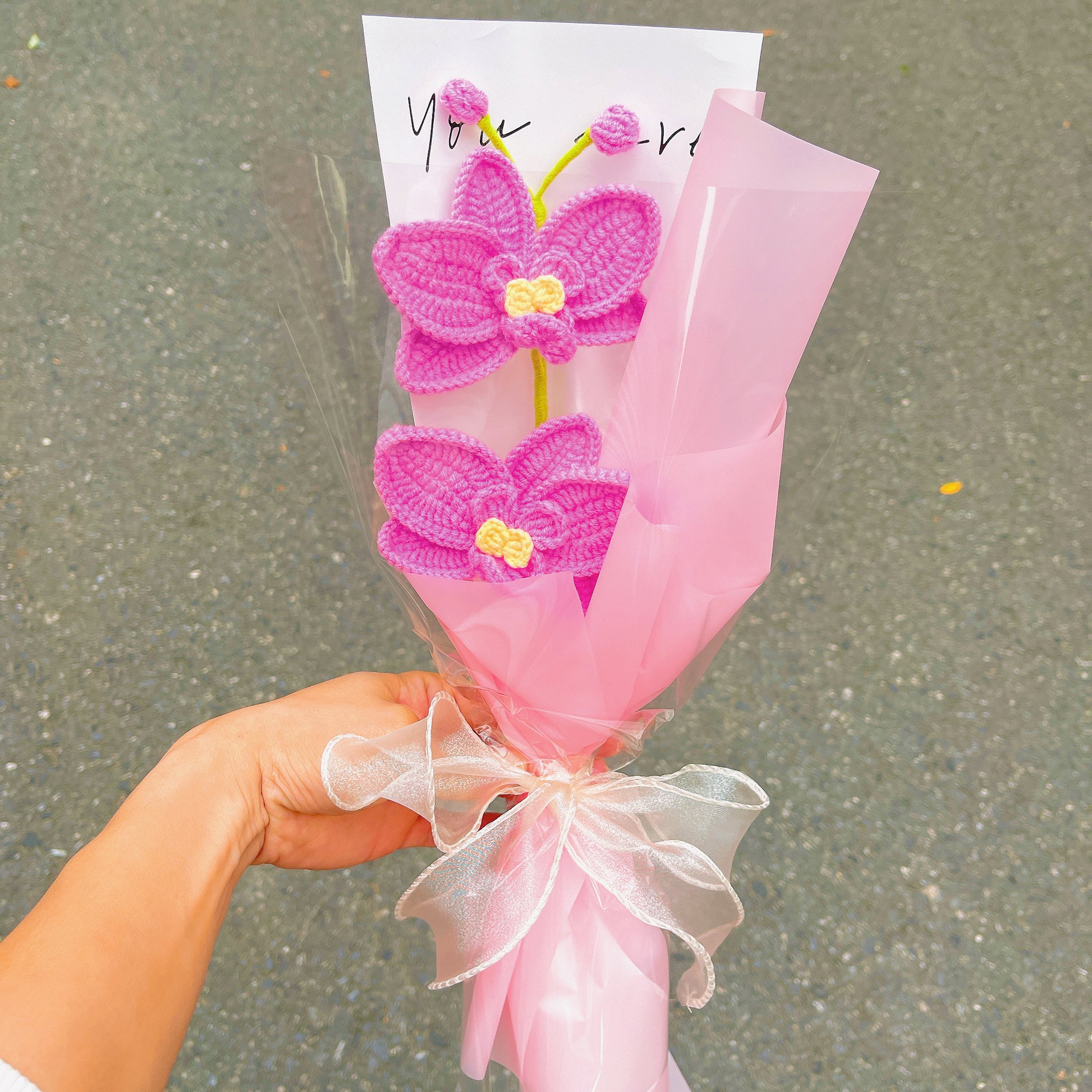 Bouquet d'orchidées du mois de naissance d'août - Cadeau de fleur d'anniversaire à tige unique crocheté à la main pour les proches nés en août
