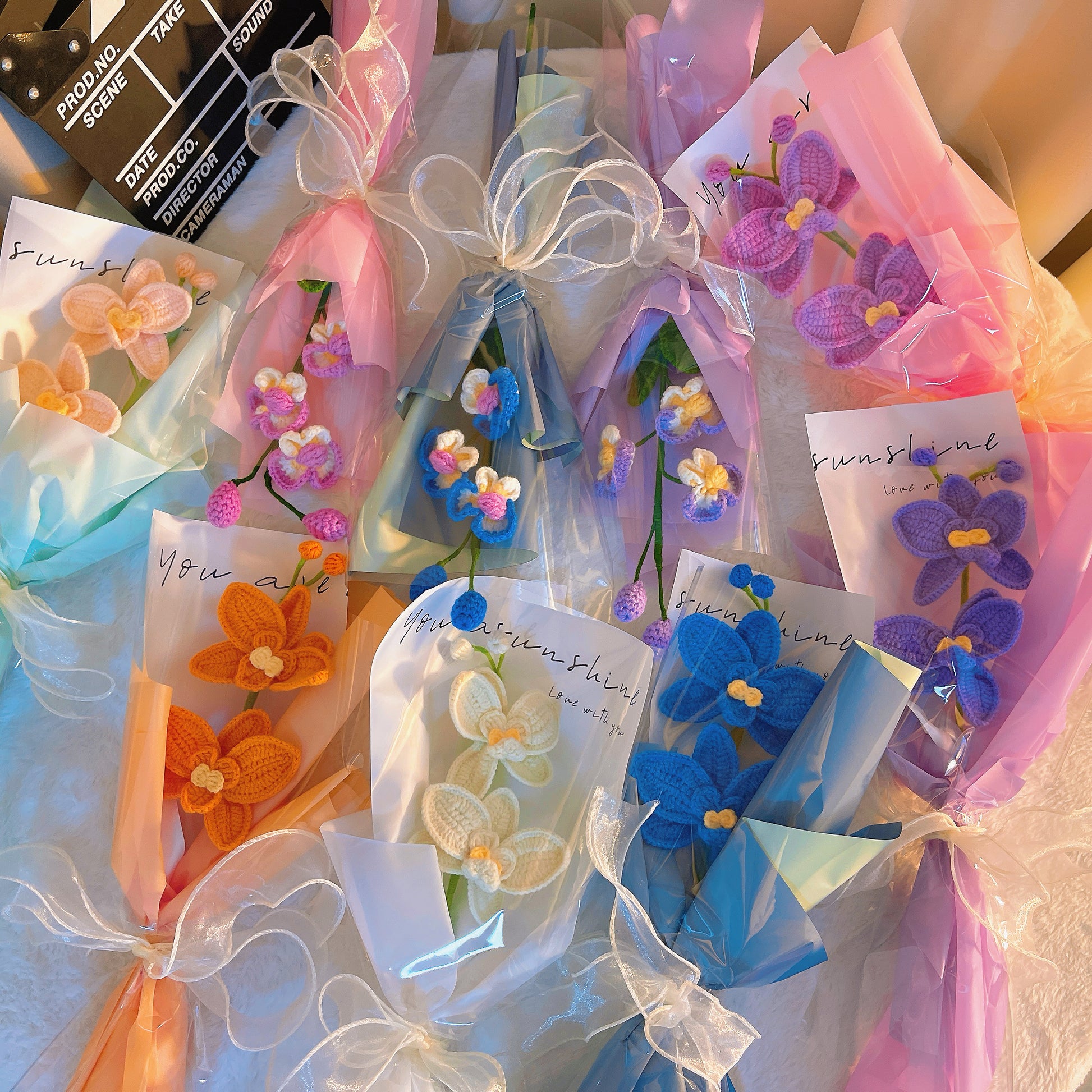 Présentation de notre superbe bouquet d'orchidées à tige unique fabriqué à la main, un chef-d'œuvre de crochetage artisanal qui captivera le cœur de tous ceux qui le contempleront. Ce bouquet exquis, délicatement emballé et prêt à offrir, présente une orchidée papillon luxuriante et vivante dans neuf couleurs vibrantes.