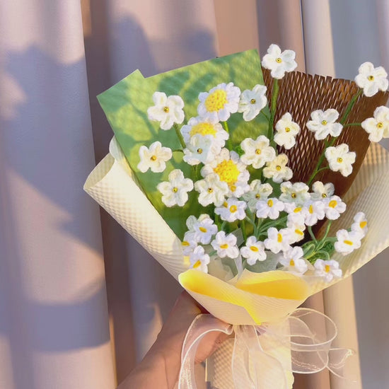 Bring the gentle magic of a starlit night indoors with our exquisite handmade crochet bouquet. This delicate arrangement combines pure white Forget-Me-Nots and soft white Daisies, artfully scattered to mimic stars glimmering in a tranquil sky. Each flower is lovingly crocheted to capture lifelike beauty, yet completely free from pollen, fragrance, and wilting—making it a perfect choice for allergy-sensitive individuals or anyone who values lasting elegance.
