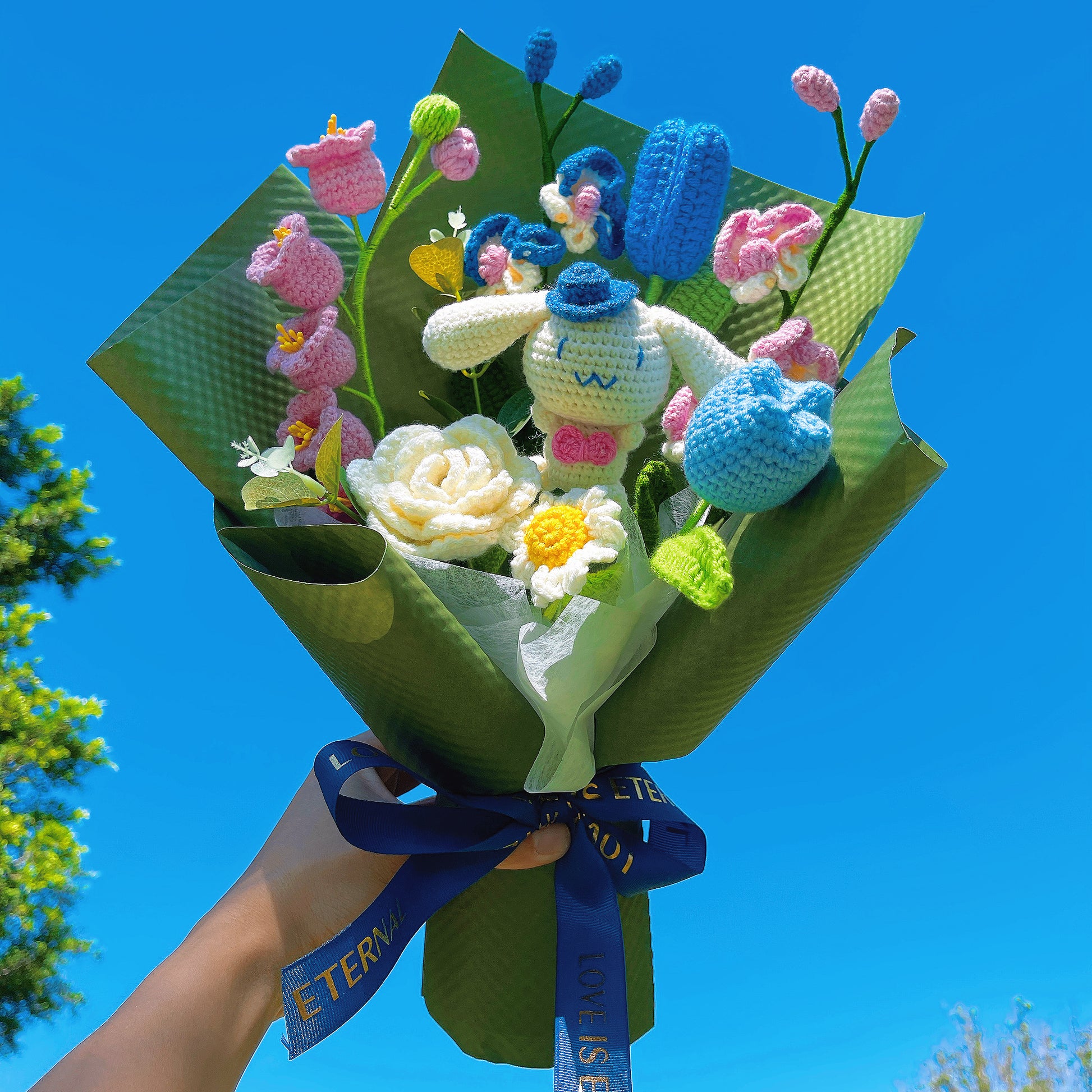 まるでキャラクターグッズのような、永遠に咲き続ける宝物! 一つひとつ心を込めて手編みしているため、表情や形が少しずつ異なります。あなただけの特別なブーケをお届けします。