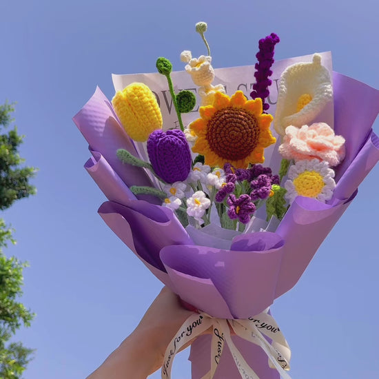 手編み 手作りかぎ針編み 花束 ラベンダー混色花束 - 愛と祝いのハーモニーブーケ|枯れない花|ラベンダー・バラ・ひなぎく・忘れな草・チューリップ 永遠の贈り物 花粉症対策・アレルギー対応