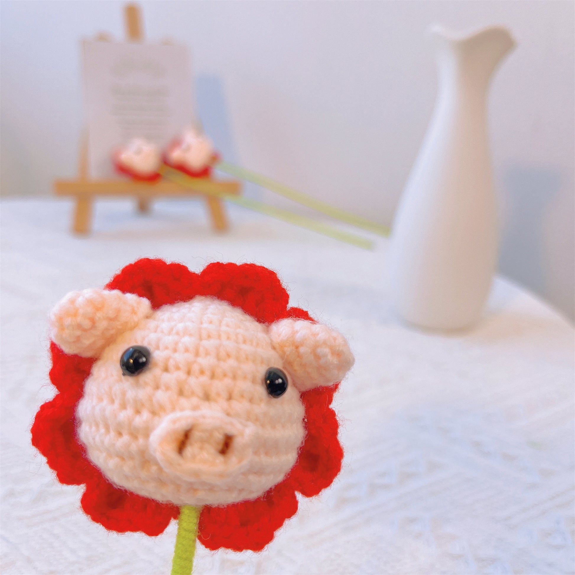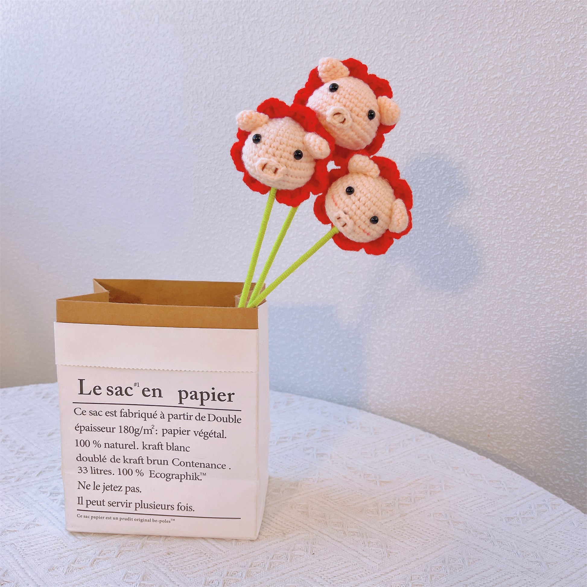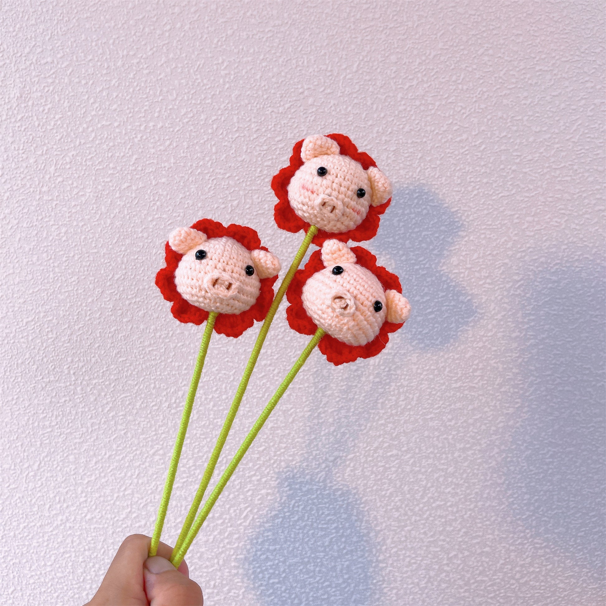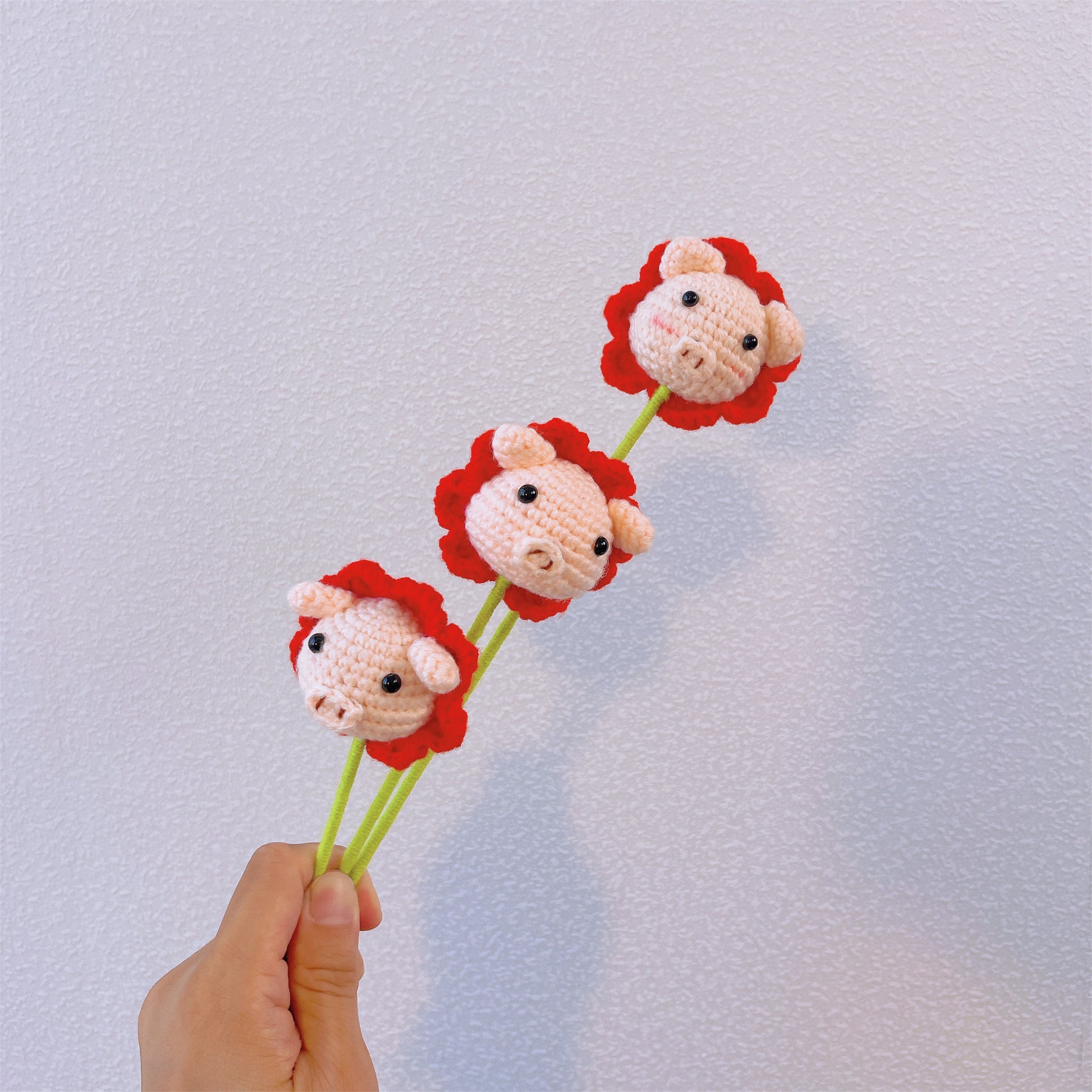 高品質な毛糸で作られたこの愛らしいオブジェは、ぶたさんのチャーミングな顔と、可愛らしいお花の飾りをモチーフにデザインされています。優しいピンクと赤の色合いが、どんな花瓶やコンテナガーデンの中でも、ひときわ目を引く存在になります。