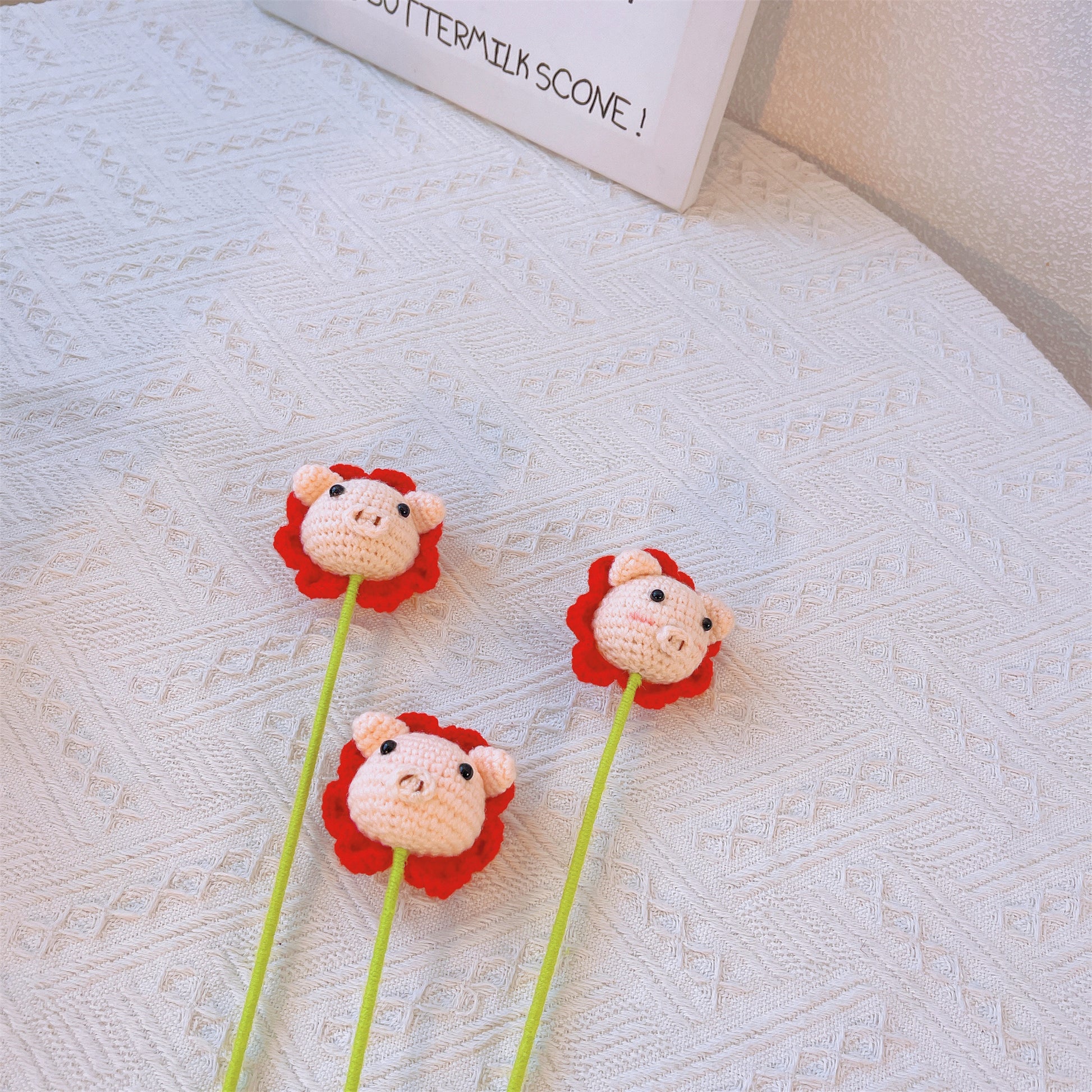 にっこり笑顔に癒やされる。お花をつけた、手編みぶたさん