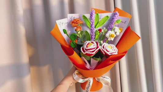 Ręcznie robiony, szydełkowy bukiet kwiatowy Piwonia, narcyz, lawenda, pomarańczowa róża, granat, liście eukaliptusa, złote listowie – Idealny na wesela, rocznice, Dzień Matki