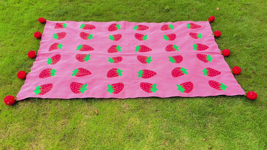 Ręcznie wykonany kociec/plecak z wzorem truskawek - miękki, gruby i uniwersalny do użytku w łóżku, na pikniku lub na zewnątrz.