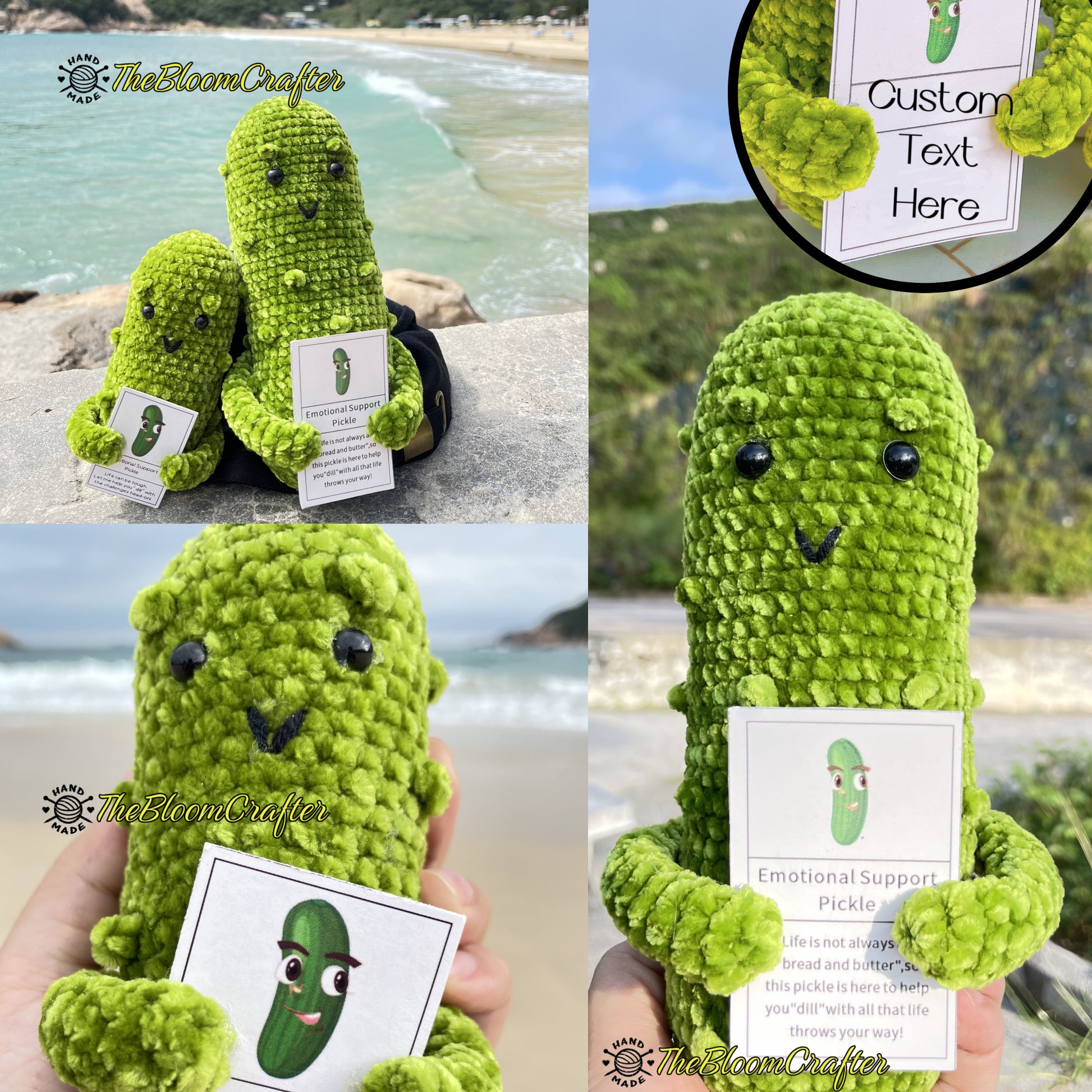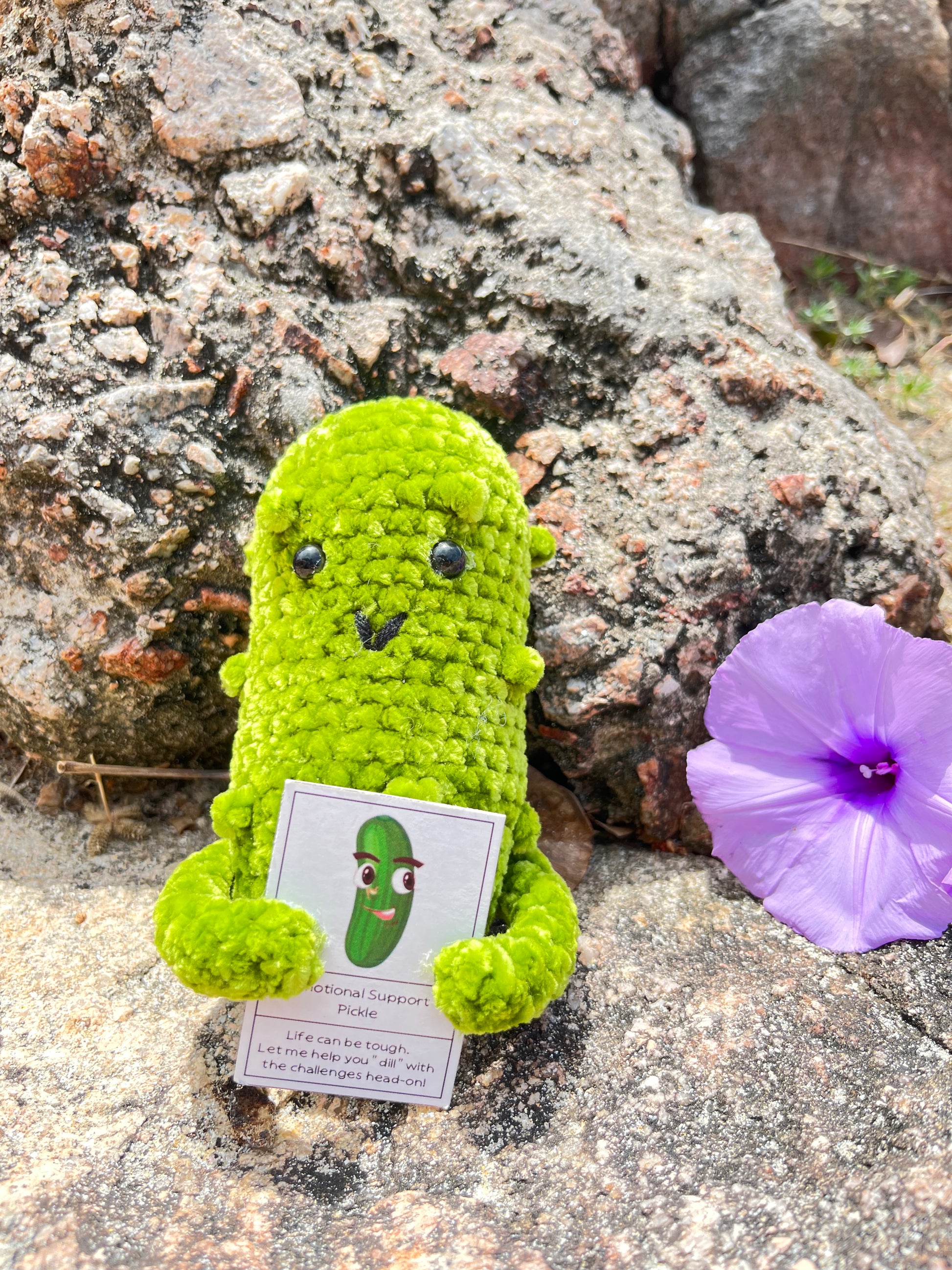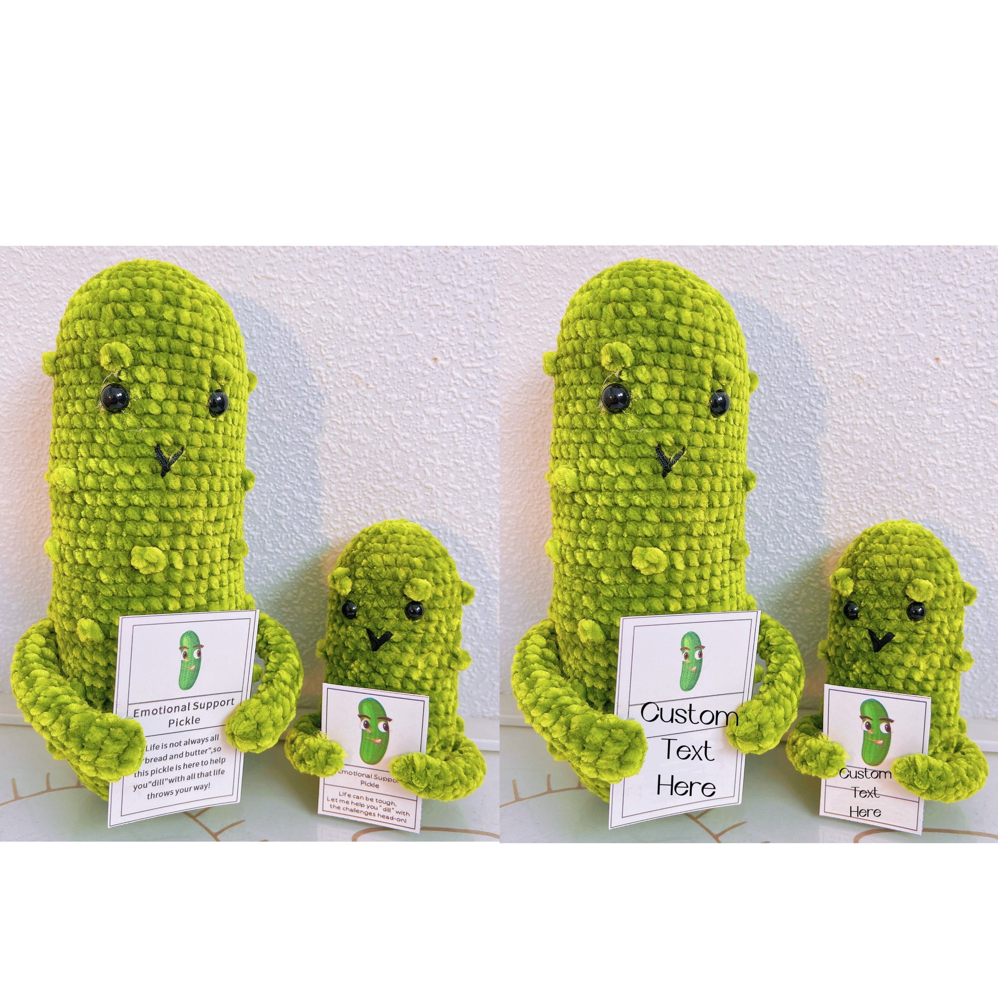 The smaller companion pickle (Pickle Pal and Dill Defender), conveniently sized to fit in the palm of your hand, serves as a steadfast ally on your journey. Take it with you wherever you go and draw strength from its comforting presence. Let this little pickle be a constant reminder that you can tackle challenges head-on and emerge victorious.