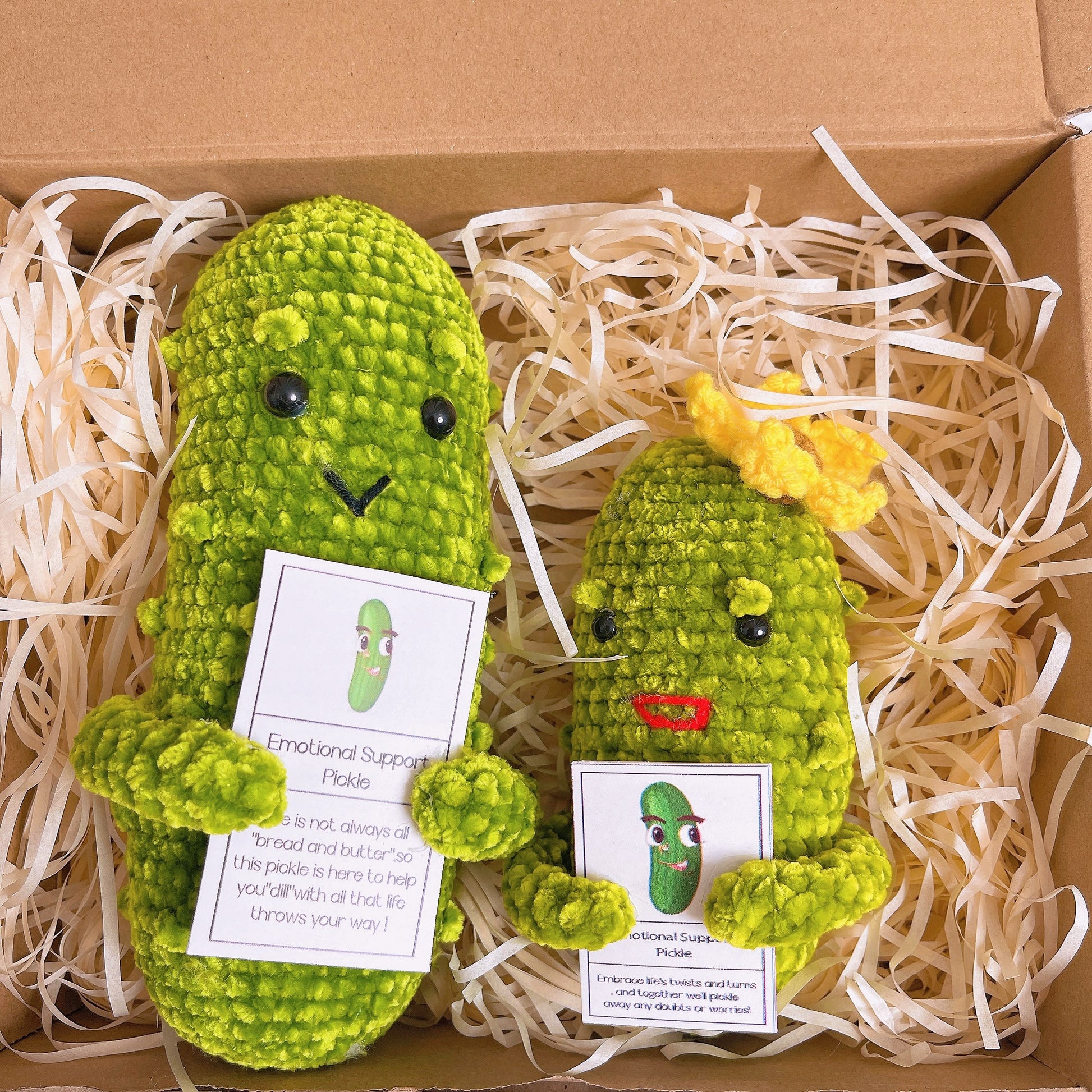 Experience the ultimate emotional support with our EmoPickle Bundle Gift Box. This thoughtfully curated set includes one large Emotional Support Pickle and one smaller companion, elegantly packaged in a charming gift box that perfectly captures the essence of our pickles.