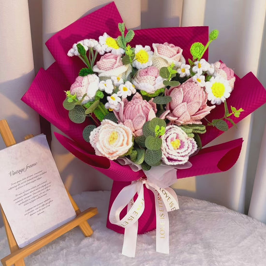 Large Handmade Crochet Flower Bouquet - Arrangement with Protea, Peony, Roses, Daisies - Allergy-Free Artificial Floral Gift for Wedding, Anniversary, Home Decor, Birthday, Valentine's Day