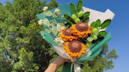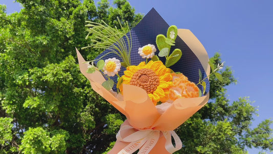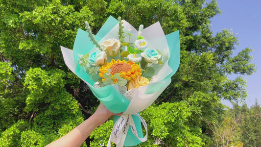 雅緻藍調手工鉤針編織花束:向日葵、鬱金香、絨球花與玫瑰的絕美組合