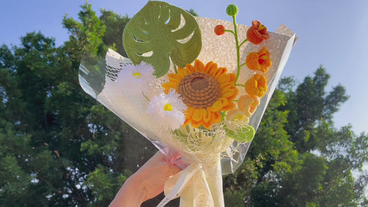 手工鉤針編織「花瓣悅語」花束:玫瑰、鬱金香、向日葵、小雛菊與康乃馨的柔美粉調交響