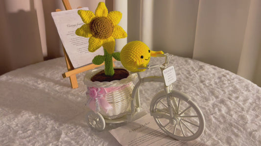 奇幻向日葵單車盆栽:手編花籃+向日葵鋼筆、LED燈串、正能量檸檬鉤織娃娃