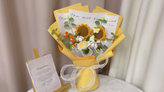 金色陽光:手工鉤針黃色花束——向日葵、圓球花、棉朵、玫瑰
