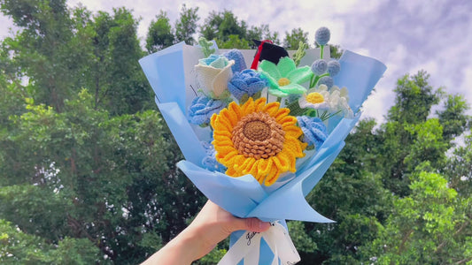 畢業系列手織鉤針花束 - 向日葵 玫瑰 勿忘我 鈴蘭,環保純素低過敏永生花禮
