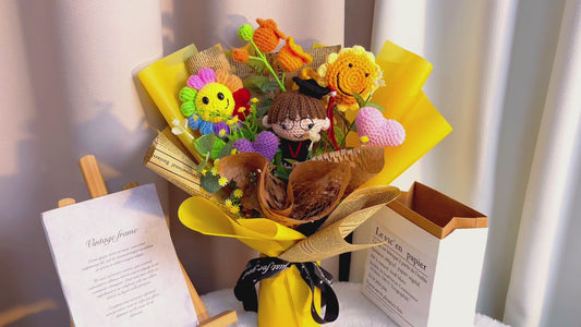手鉤畢業花束 - 畢業男孩戴帽與眼鏡、微笑向日葵、鈴蘭、低過敏性花禮
