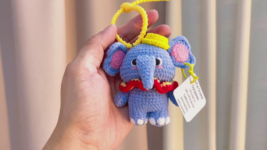 手工鉤針大象鑰匙圈 - 粉紅裙裝&頭戴黃花的小象,附可客製化留言卡,低過敏可愛禮物,適合孩童、大象愛好者及歡樂慶典