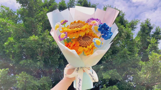 花屋系列手工鉤針向日葵花束與陽光色玫瑰-準備贈送無過敏人造花