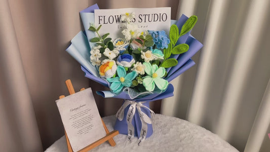 手工絨鉤編織「海洋甯靜」花束 - 藍玫瑰、飛燕草、鬱金香與雛菊的絕美組合