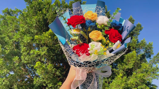 手工鉤針花束(附船長造型公仔)|深藍郁金香、淺粉玫瑰、紅色修長型郁金香、白/紅/深藍圓潤型郁金香|適合各種場合