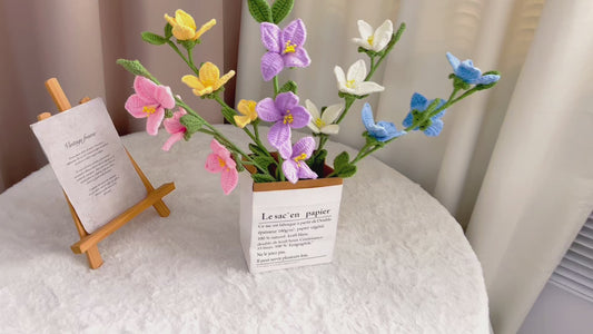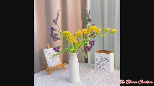 手工鉤針小蒼蘭花-黃色和紫色,5朵花和2個花蕾-婚禮、生日和家居裝飾的完美防過敏禮物