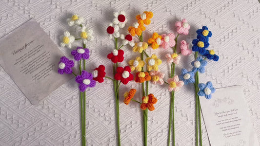 鉤針編織帝王花包裝花束 - 多色手工漸層花卉搭配愛心裝飾,適合花粉過敏、乾草熱患者