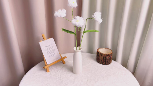 手工鉤針白色蒲公英花束 - 蓬鬆柔軟花朵、綠色莖幹、黃色花心