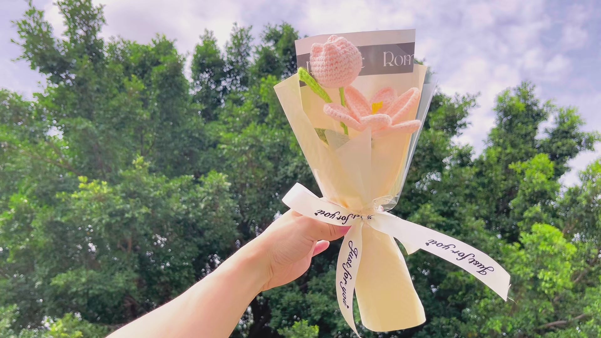 緋紅誓約手鉤鬱金香花束 - 雙色手作鬱金香,低過敏初見禮,春季婚禮/週年紀念/浪漫贈禮首選