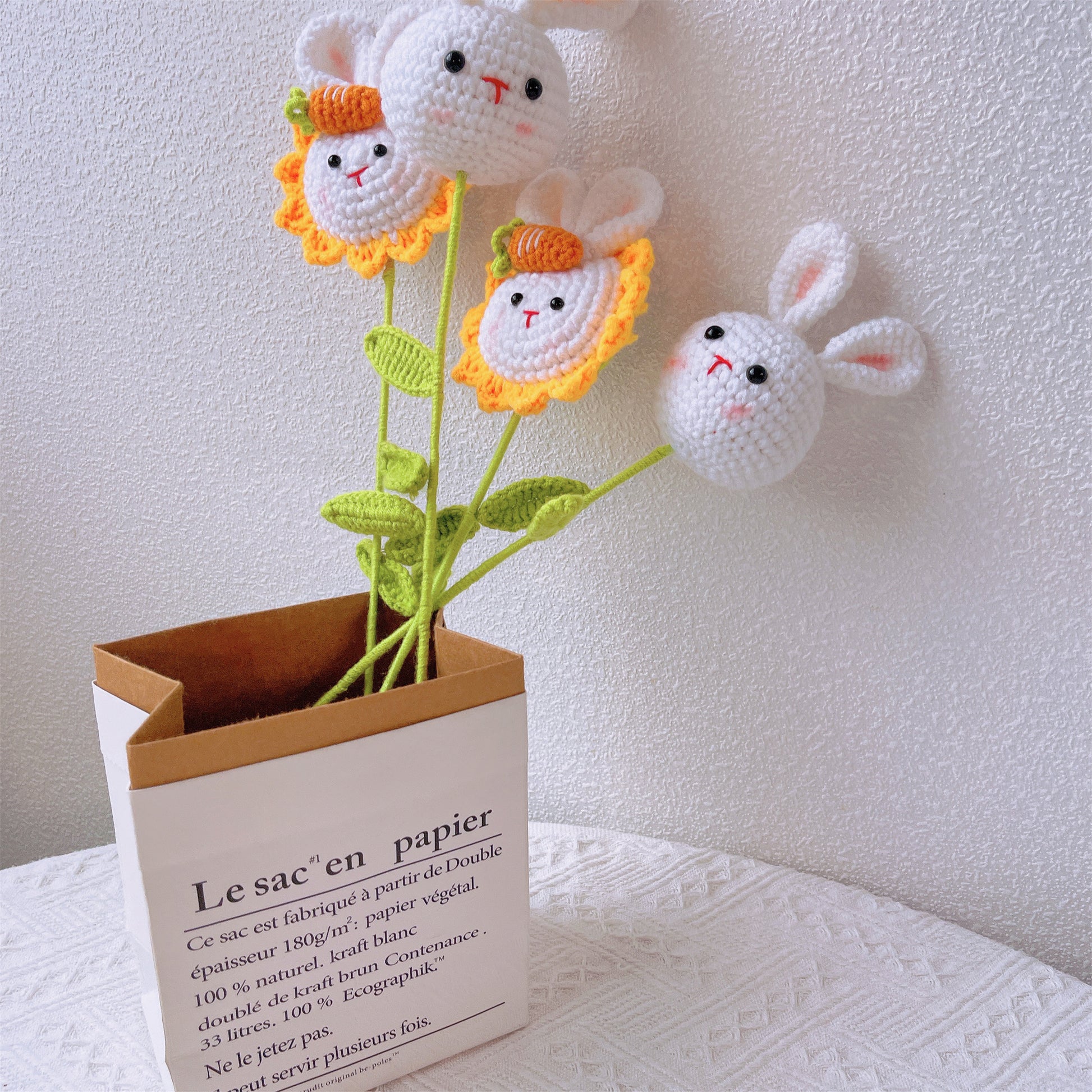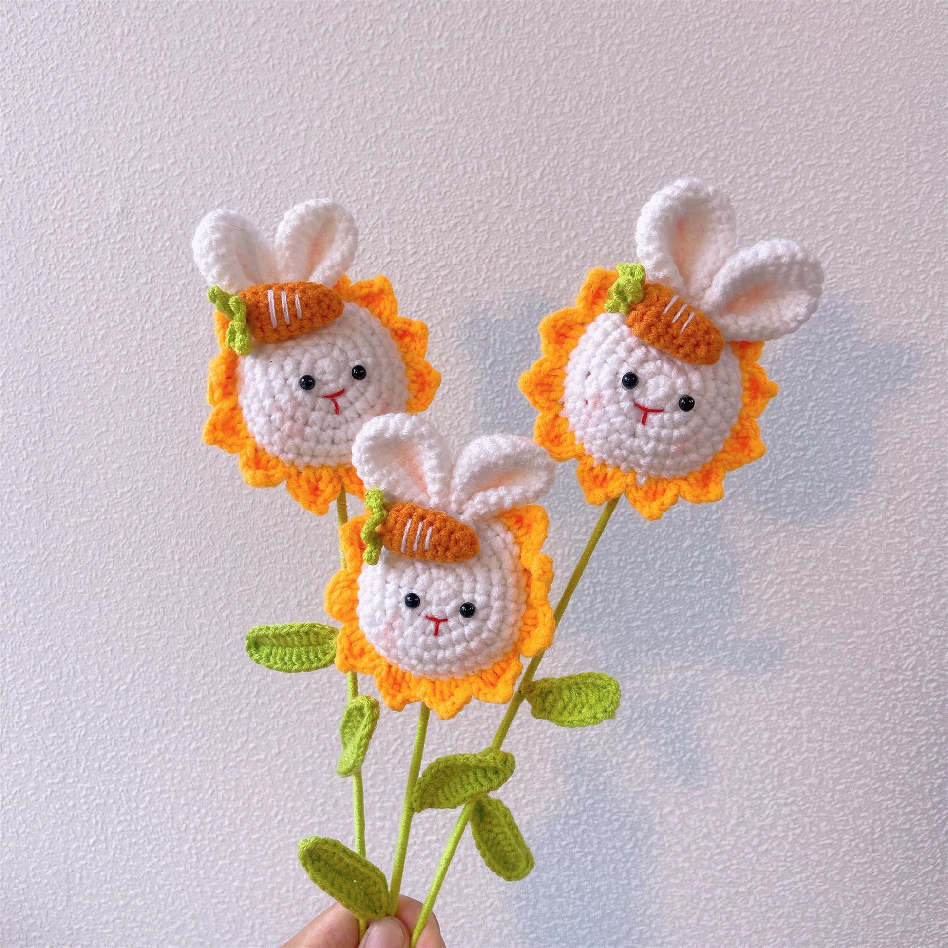 萌兔樂境:手工鉤織可愛兔頭桿飾(附兔子與向日葵造型收尾),打造奇幻花園裝飾