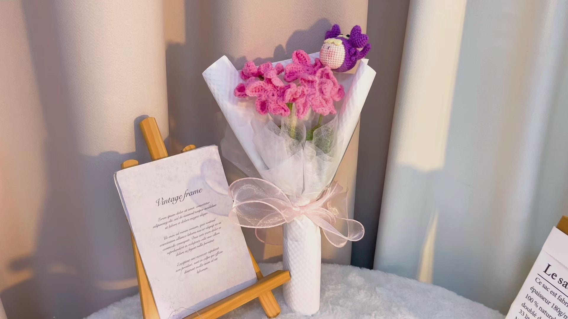 神祕天蠍座:手作鉤織天竺葵花束用我們迷人的手作鉤織天竺葵花束,來慶祝充滿熱情的天蠍座靈魂吧!這份花禮由大膽的桃紅色天竺葵組成,搭配一隻充滿神祕感的蠍子玩偶。花束以純淨的白色格紋紙優雅包裹,完美捕捉天蠍座強烈又磁性十足的特質,100% 不過敏、無花粉,特別適合敏感的靈魂。
