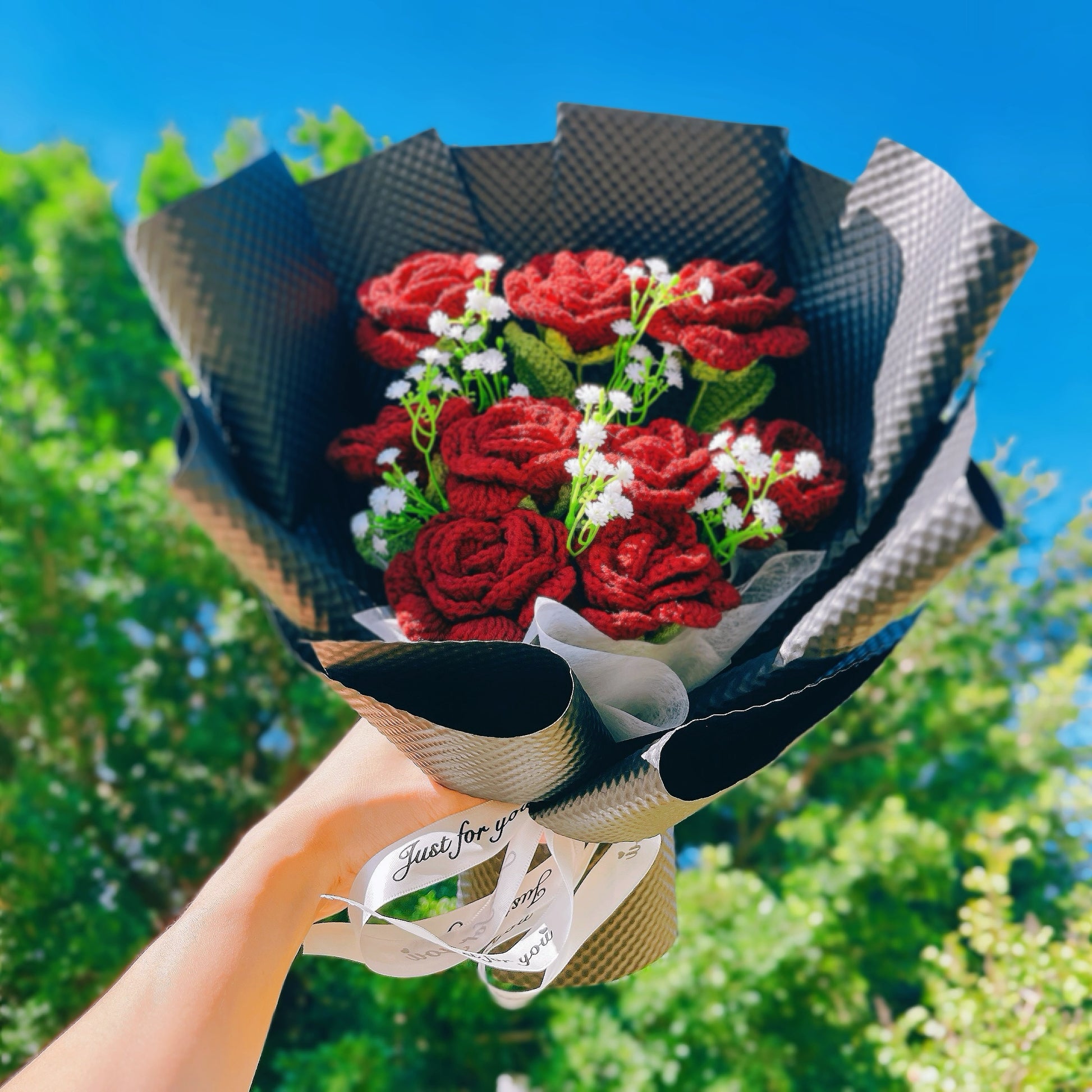 手工絨鉤編織「璀璨財富」9朵紅玫瑰花束 - 適合任何場合的絕美禮物