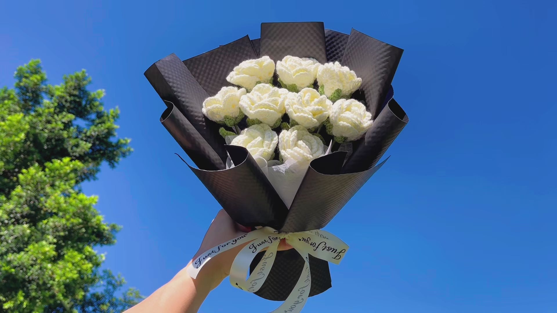 獻上永恆的敬意:經典優雅的追思花禮獻上這束莊重的手作鉤織花束,讓它成為一份永恆的思念。我們精心鉤織九朵潔白的玫瑰,搭配典雅的黑色格紋包裝紙,純粹的單色調完美傳達了深深的敬意。這束花是那些尋求傳統又永不凋謝的悼念花禮的最佳選擇。