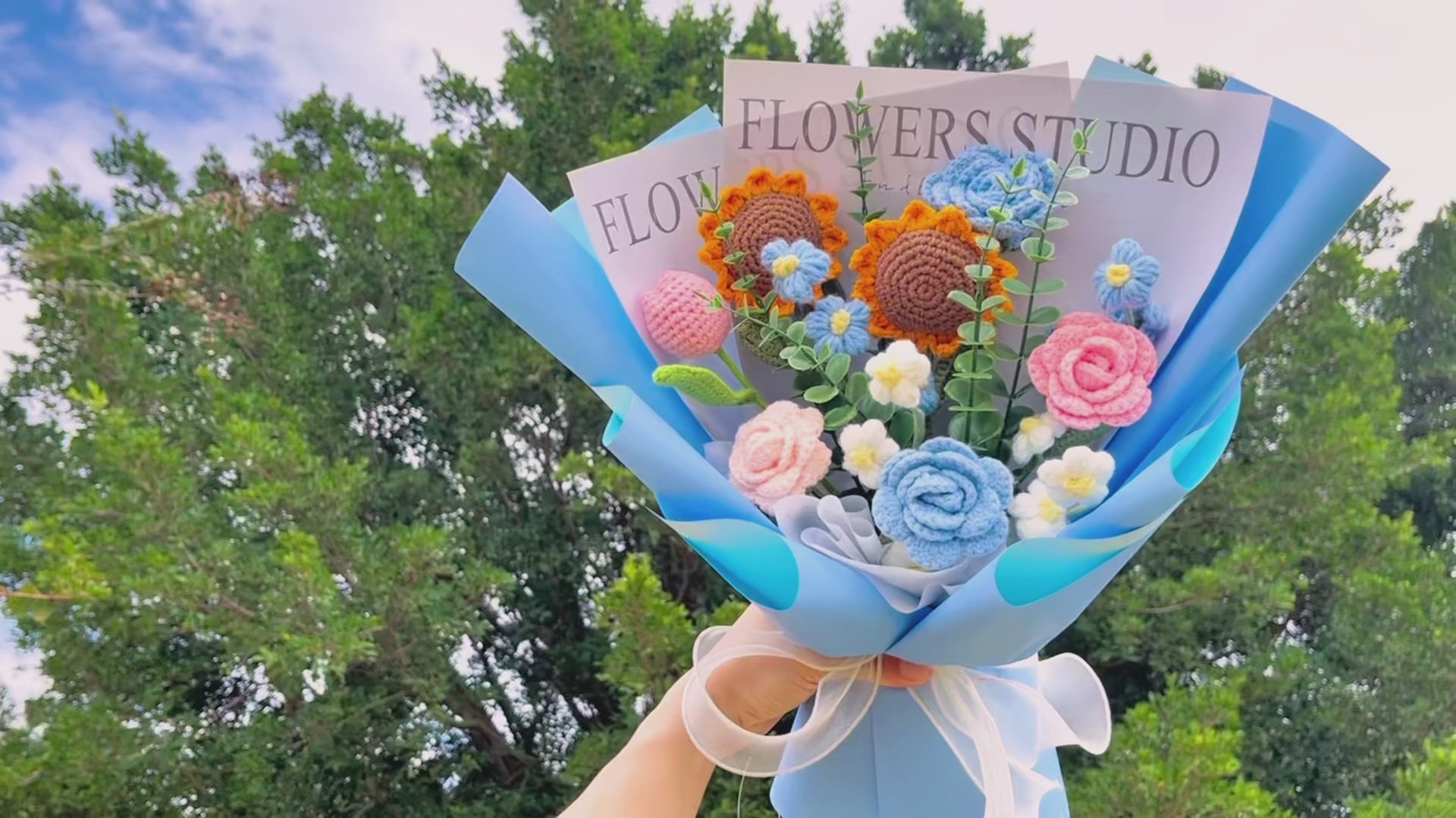 雅緻藍調手工鉤針編織花束:向日葵、鬱金香、絨球花與玫瑰的絕美組合