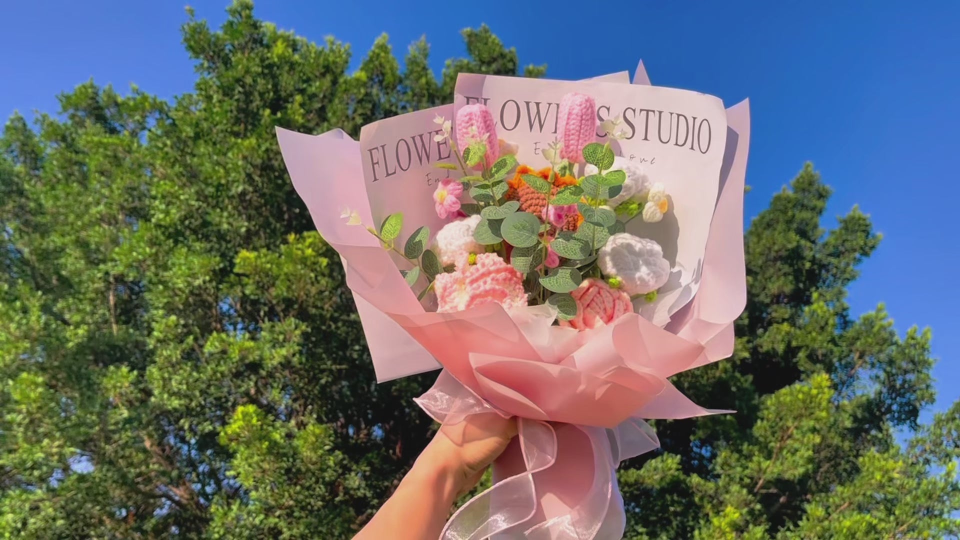 手工絨鉤編織「暈紅雅韻」花束,含玫瑰、鬱金香、百合、尤加利葉等 - 適合任何特殊場合
