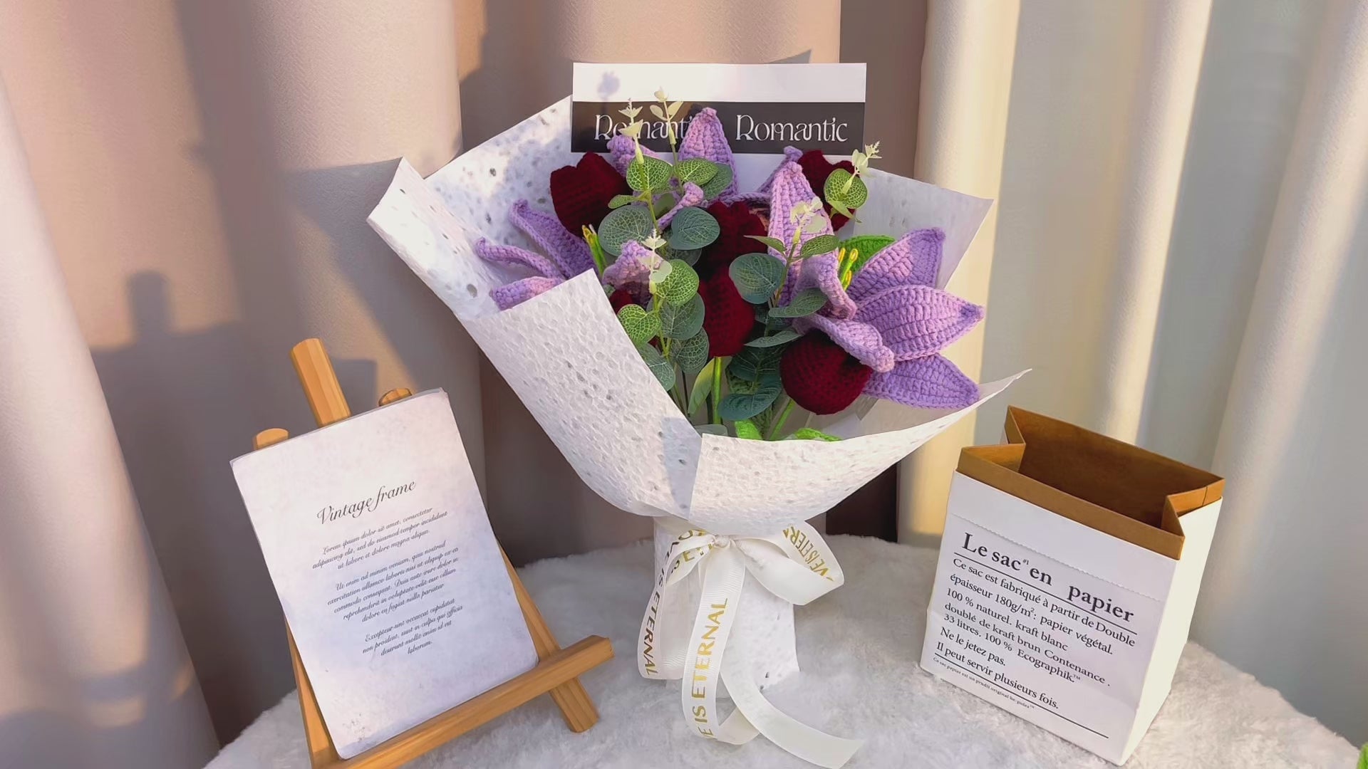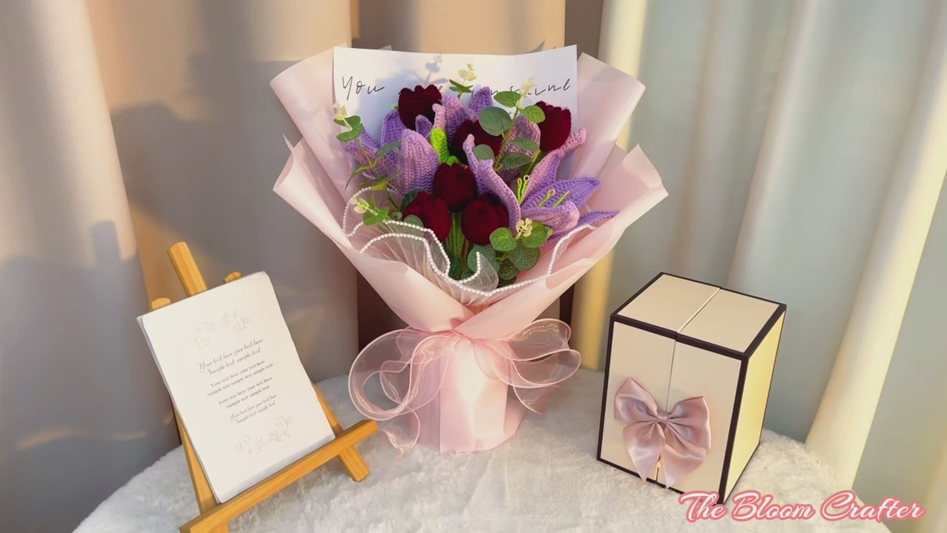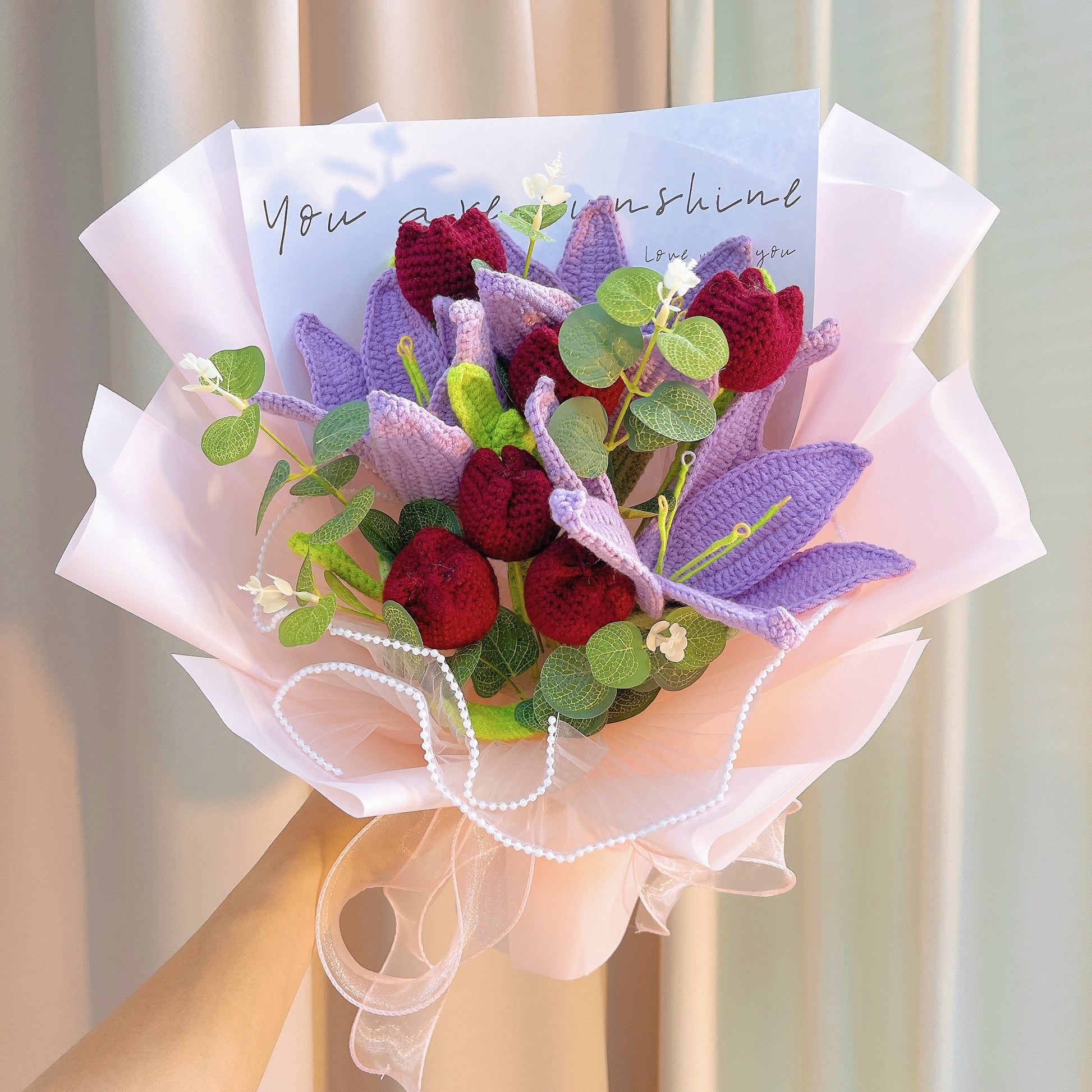 永恆雅致鉤針花束 - 手工製作紫羅蘭色百合與勃艮第酒紅色鬱金香 - 花粉症探病禮物之選|婚禮、生日、週年慶及家居裝飾的理想禮品