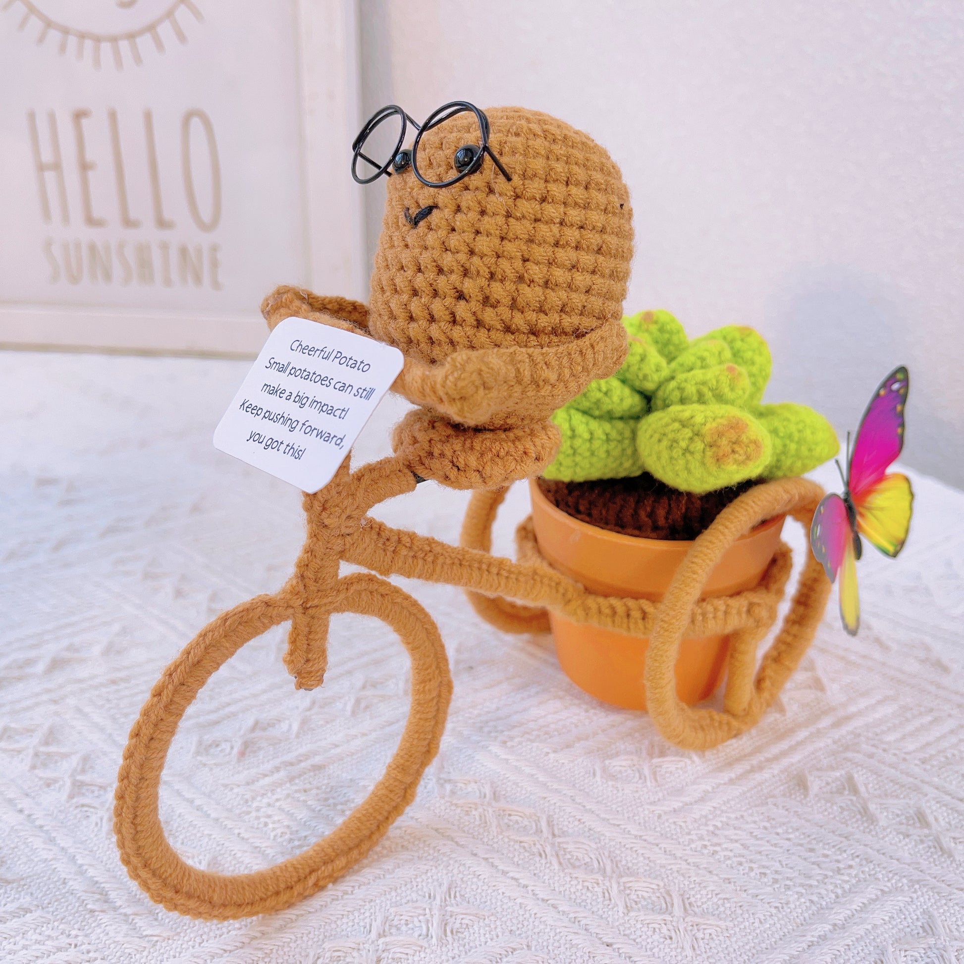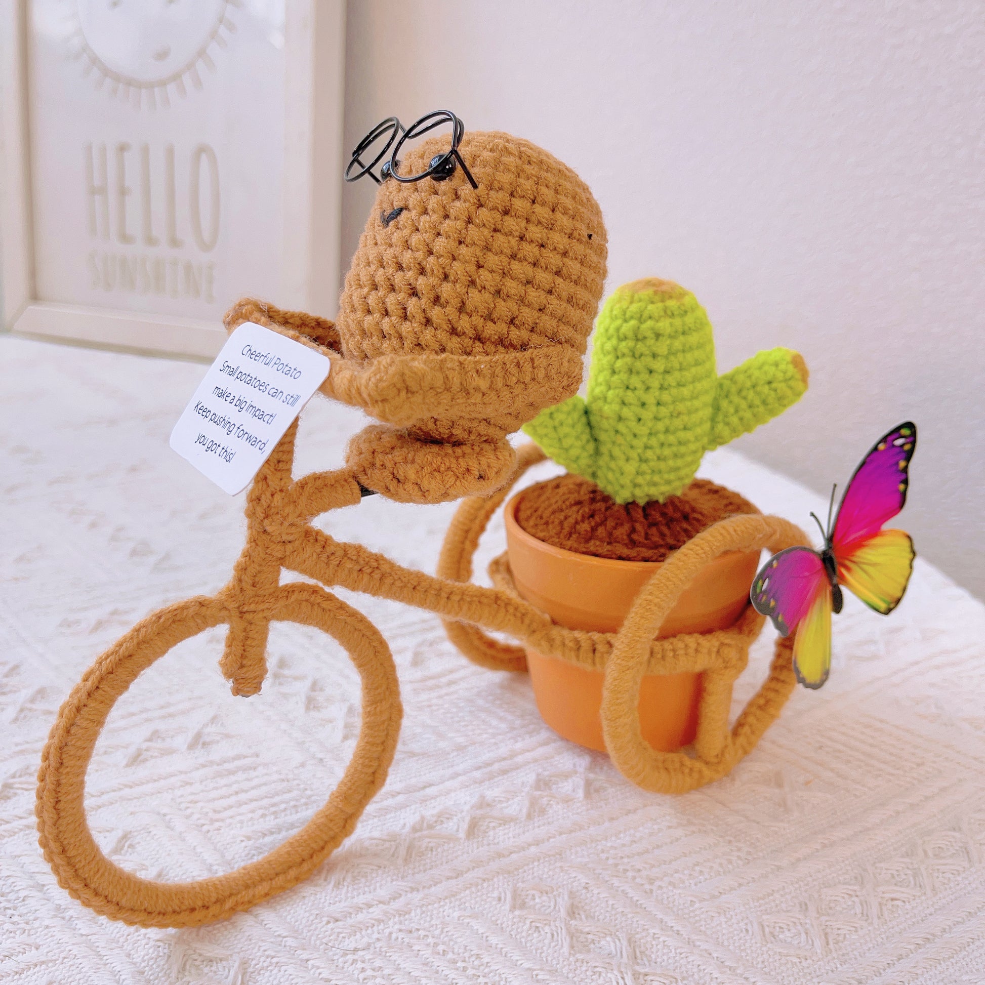 Hand-Crocheted Cheerful Potato Succulent Cactus Bicycle Décor - Unique Home Decoration Centerpiece Birthday Gift Desk Workspace