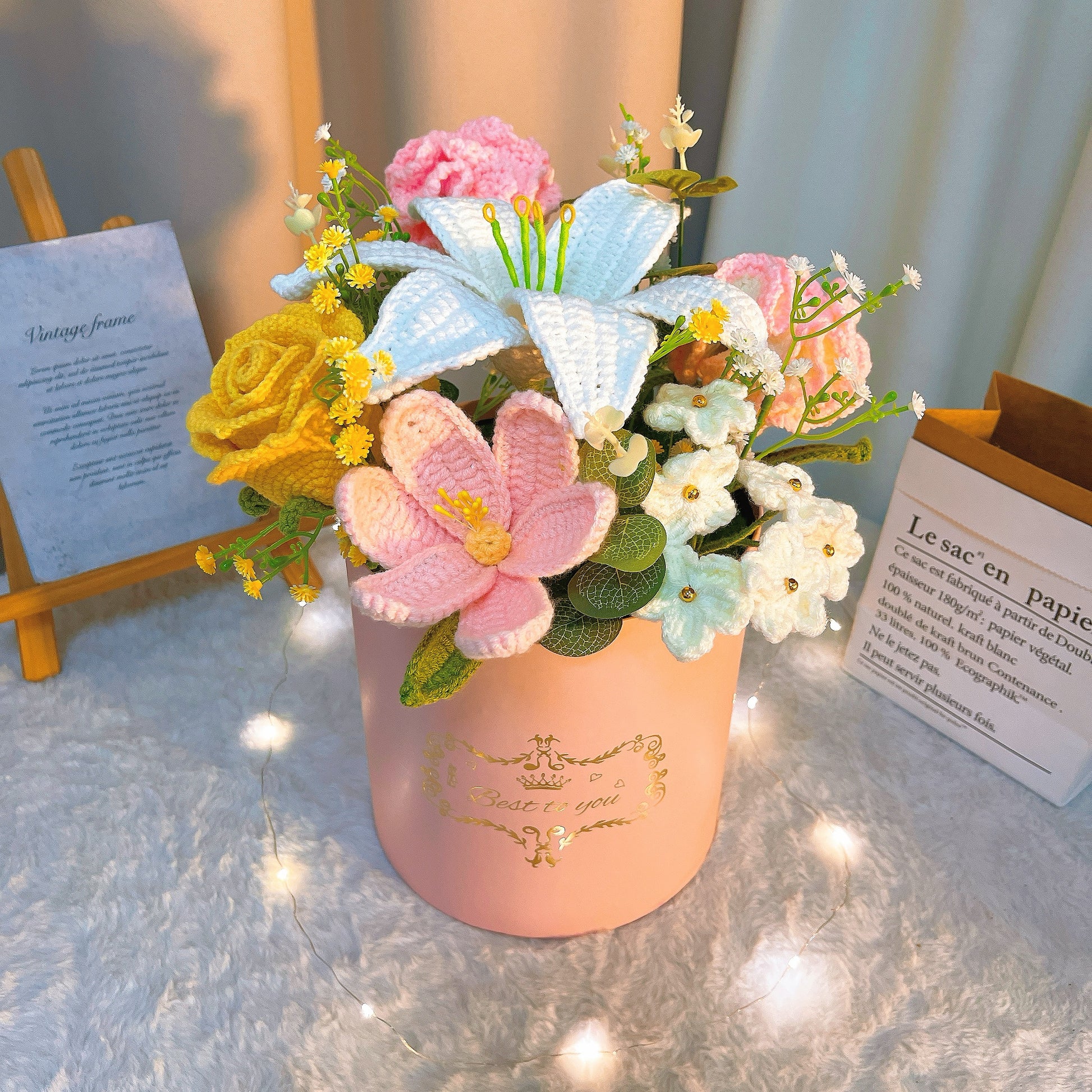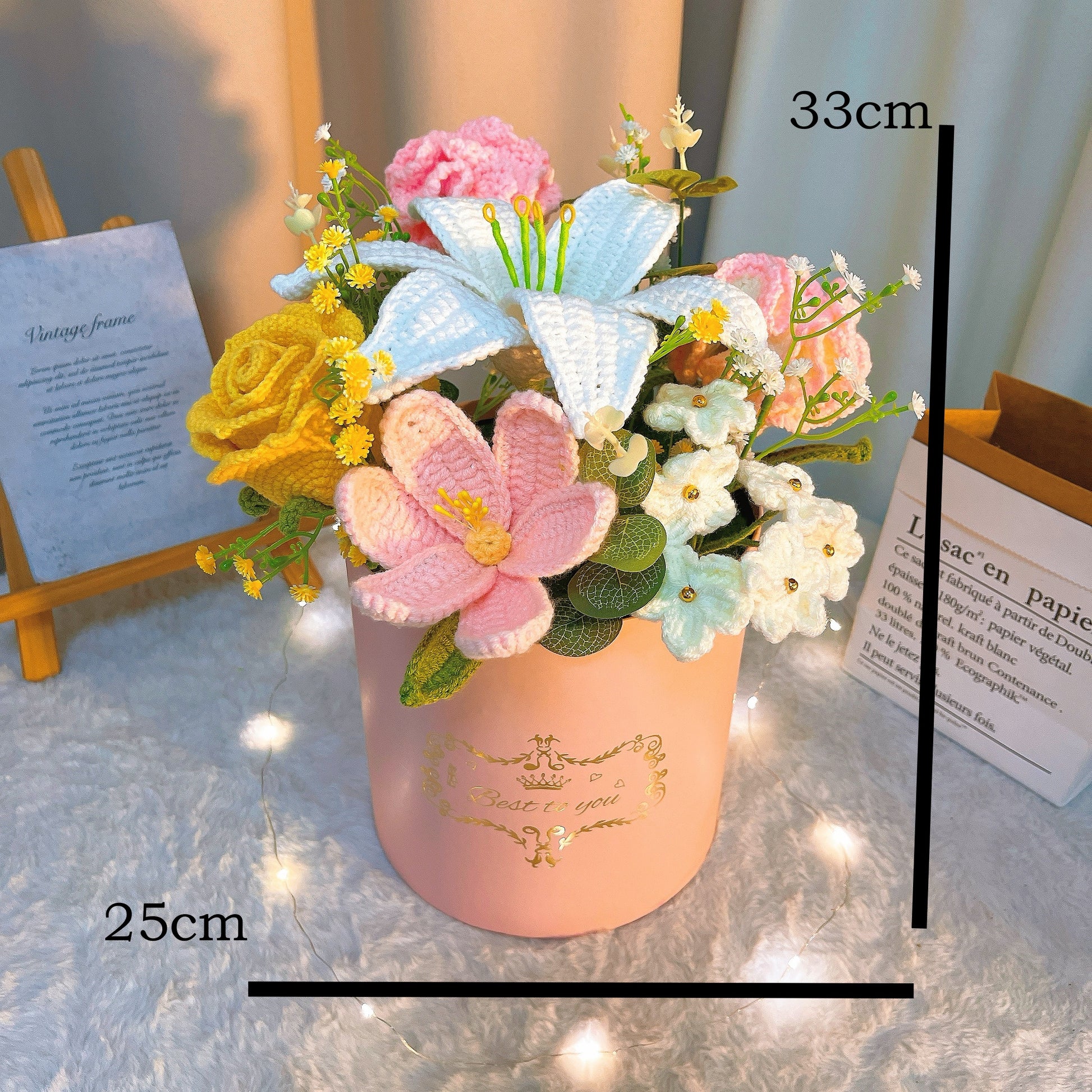 粉紅色桶中的手工鉤針花束–人造玫瑰、百合、鬱金香、康乃馨、滿天星等–低過敏、無過敏的母親節禮物、婚禮、生日、家居裝飾