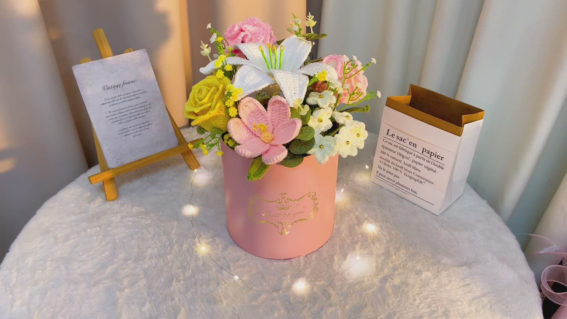 手工絨鉤編織「暈紅雅韻」花束,含玫瑰、鬱金香、百合、尤加利葉等 - 適合任何特殊場合