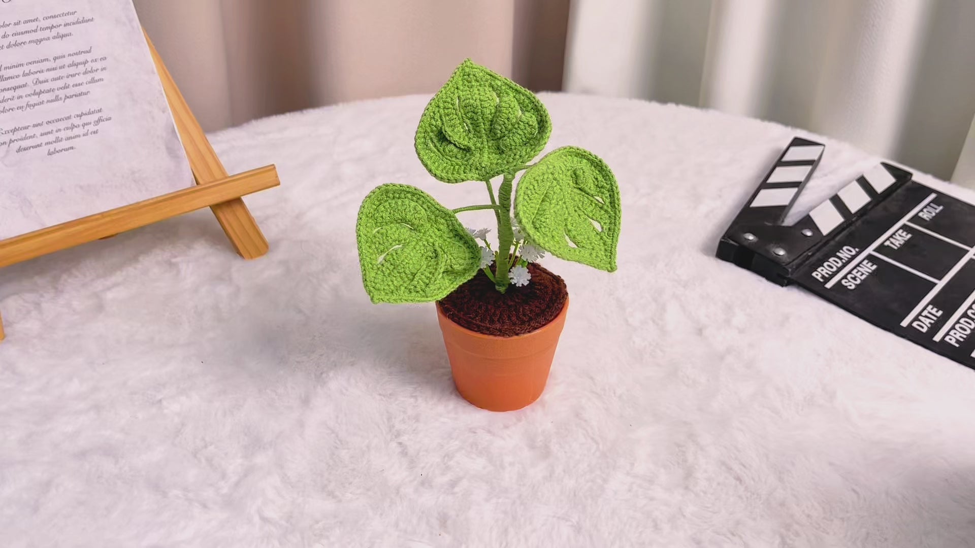 手工鉤針編織冠竹盆栽裝飾-3株綠意盎然的琴葉榕造型 + 白色星點點綴 -完美適合過敏體質的禮物之選
