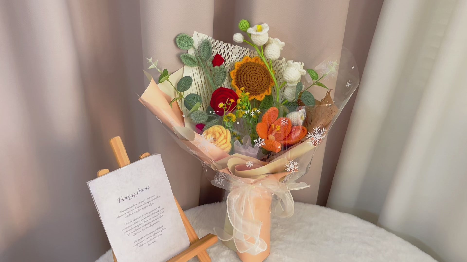 花束中展示了各式各樣精心鉤織的花朵,每朵都象徵著不同的情感,為整體佈置增添了獨特的魅力。火紅的山茶花代表著愛與激情,而閃耀的向日葵則象徵著崇拜與忠誠。純白的鈴蘭花,象徵著純潔與無辜。金黃的玫瑰蘊含著歡樂與友誼,而盛開的橙色鬱金香則寓意著溫暖與豐盈。搭配這些花朵的,還有精緻的黃色滿天星和栩栩如生的人工招財樹葉,為花束增添了一絲奇幻與自然的優雅。