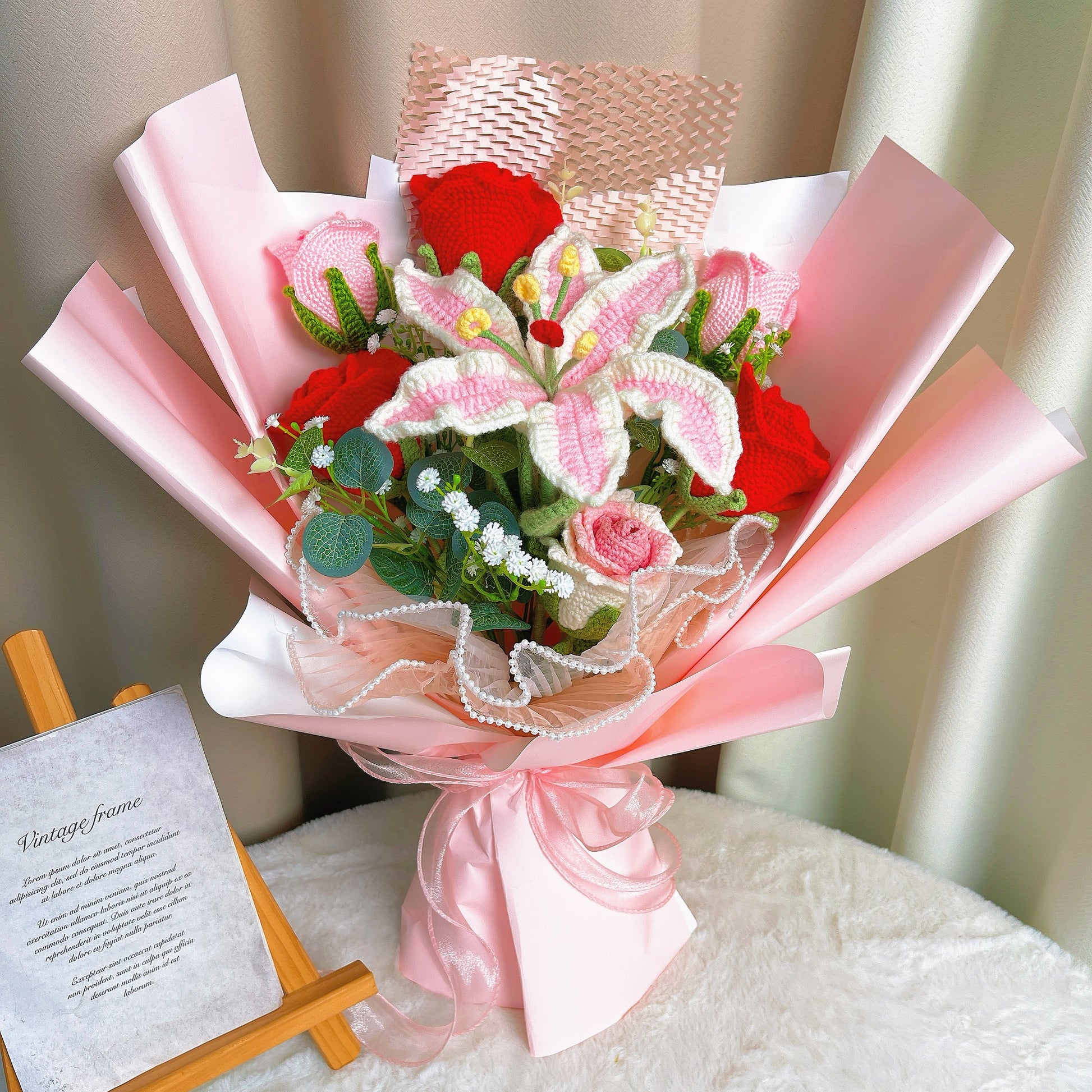 花束中的各種花卉皆蘊含特殊意涵——玫瑰象徵著愛與美麗,勿忘我代表著記憶,非洲菊則寓意著歡欣。這款手工鉤針編織花束適合作為任何場合的貼心禮物,從母親節到婚禮,再到週年慶,都能傳達出深情厚誼。