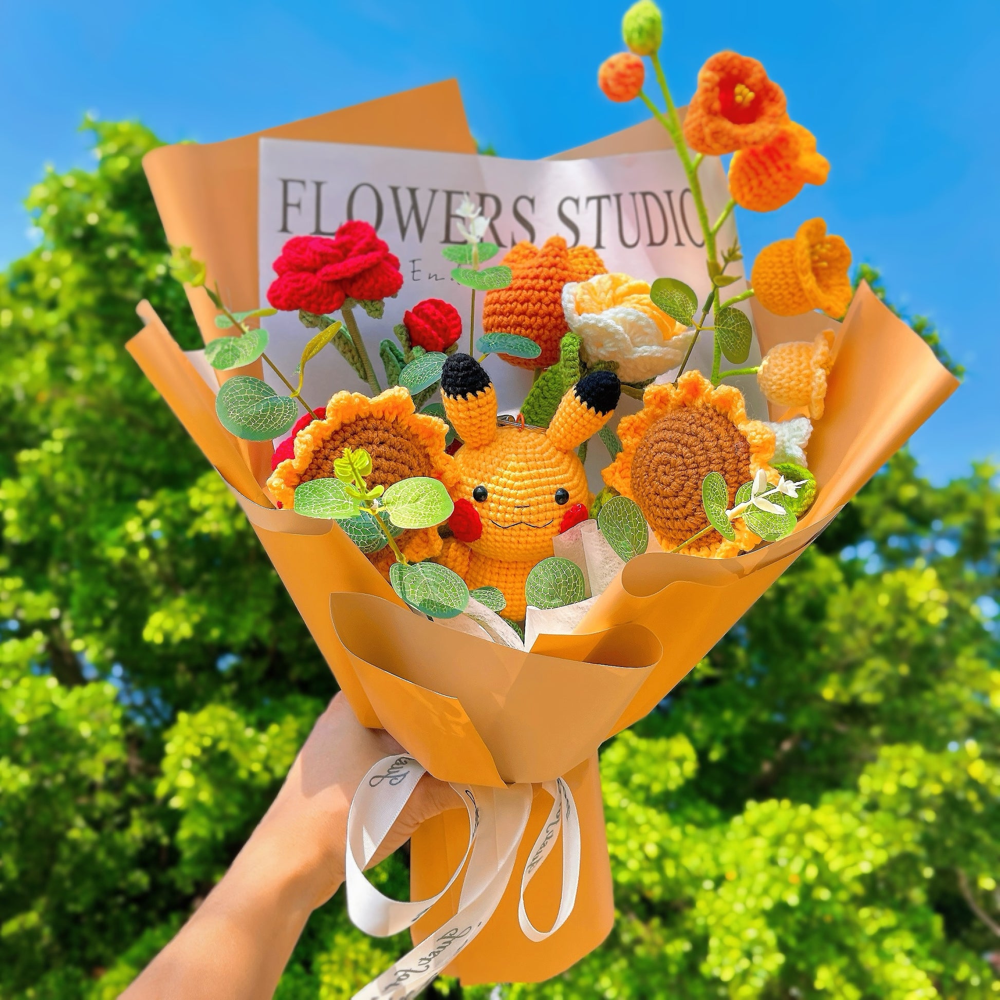 手作鉤針寶可夢主題花束 - 玫瑰鬱金香向日葵鈴蘭永久花|無花粉過敏禮物|動漫慶生週年紀念